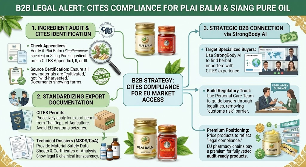 Alex: “เรามาแก้ทีละขั้นตอนครับ ก่อนอื่นเรื่องไพล (Zingiber cassumunar): ไม่อยู่ในบัญชีไซเตส (CITES Appendices) ผมตรวจสอบจาก Species+ และแหล่งข้อมูลทางการแล้ว ไม่ใช่พืชใกล้สูญพันธุ์และปลูกกันแพร่หลายในไทย จึงไม่ต้องมีใบอนุญาต CITES ส่วนเซียงเพียวอิ๊วส่วนประกอบหลักคือเมนทอล, การบูร, กานพลู, สะระแหน่ ก็ไม่ได้ถูกจำกัดครับ ส่วนเรื่อง FDA ไทย: สินค้าสองอย่างนี้มักจัดอยู่ในกลุ่ม ‘ผลิตภัณฑ์สมุนไพร’ หรือ ‘เครื่องสำอาง’ หากใช้ทาภายนอกและระบุสรรพคุณว่า ‘External relief’ แต่ถ้าไปเคลมว่า ‘รักษาโรค’ (Cure disease) จะเข้าข่าย พรบ. ยา ซึ่งจะซับซ้อนกว่า”